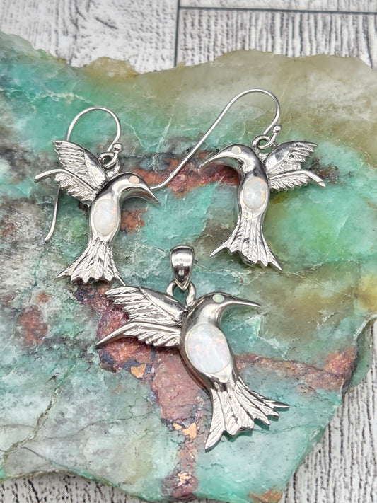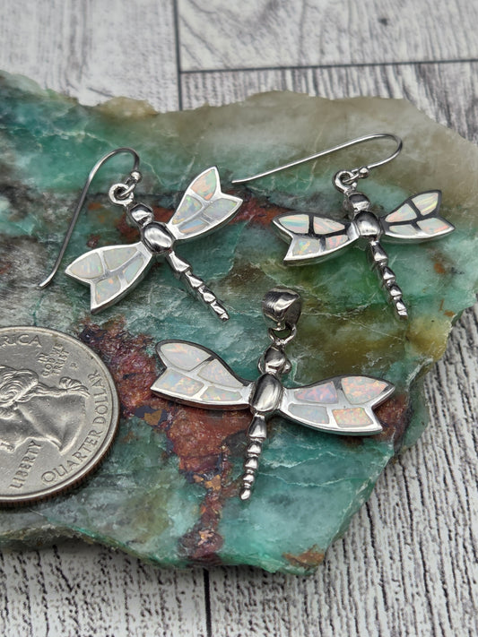 Sterling Silver Opal Dragonfly Pendant and Earring Set