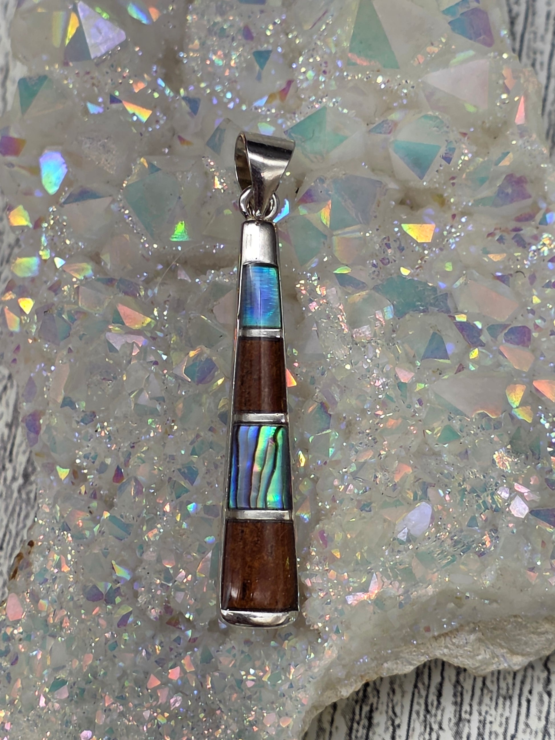 This sterling silver pendant is such a beautiful Hawaii inspired stack, alternating abalone shell and koa wood. The contrast is stunning, that ocean shimmer paired with warm, earthy wood, and the layered design gives it depth and character while still feeling easy to wear.