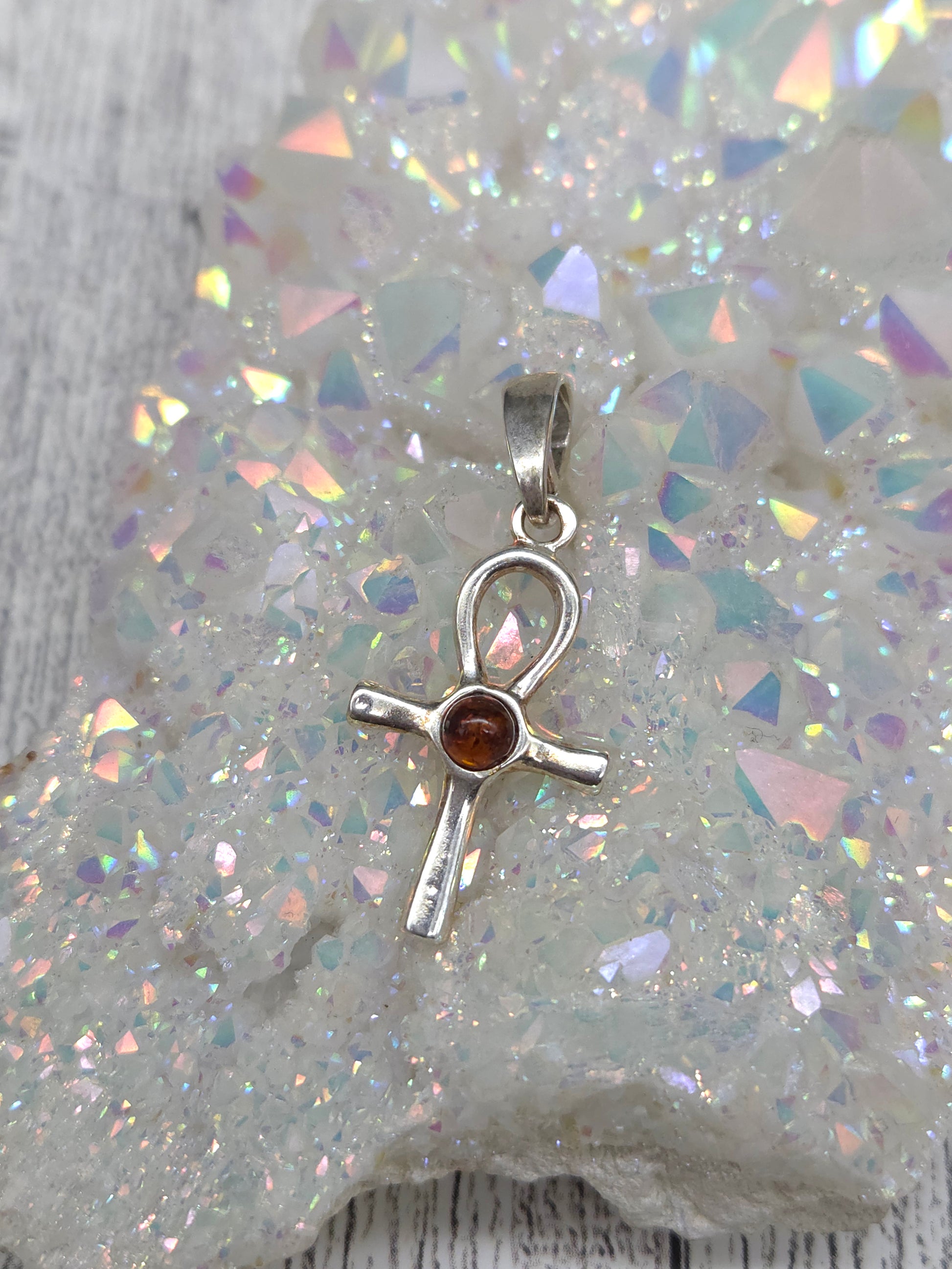 This meaningful Sterling Silver Ankh Pendant is set with a warm round brown Baltic amber cabochon at its center, merging ancient symbolism with natural beauty. The ankh, known as the Egyptian key of life, symbolizes vitality, eternal life, and divine protection. Paired with amber renowned for its grounding, purifying, and uplifting energy this pendant becomes a sacred tool for spiritual balance and strength. It’s a powerful piece for those seeking protection, life-force energy, and ancient wisdom in their daily journey.