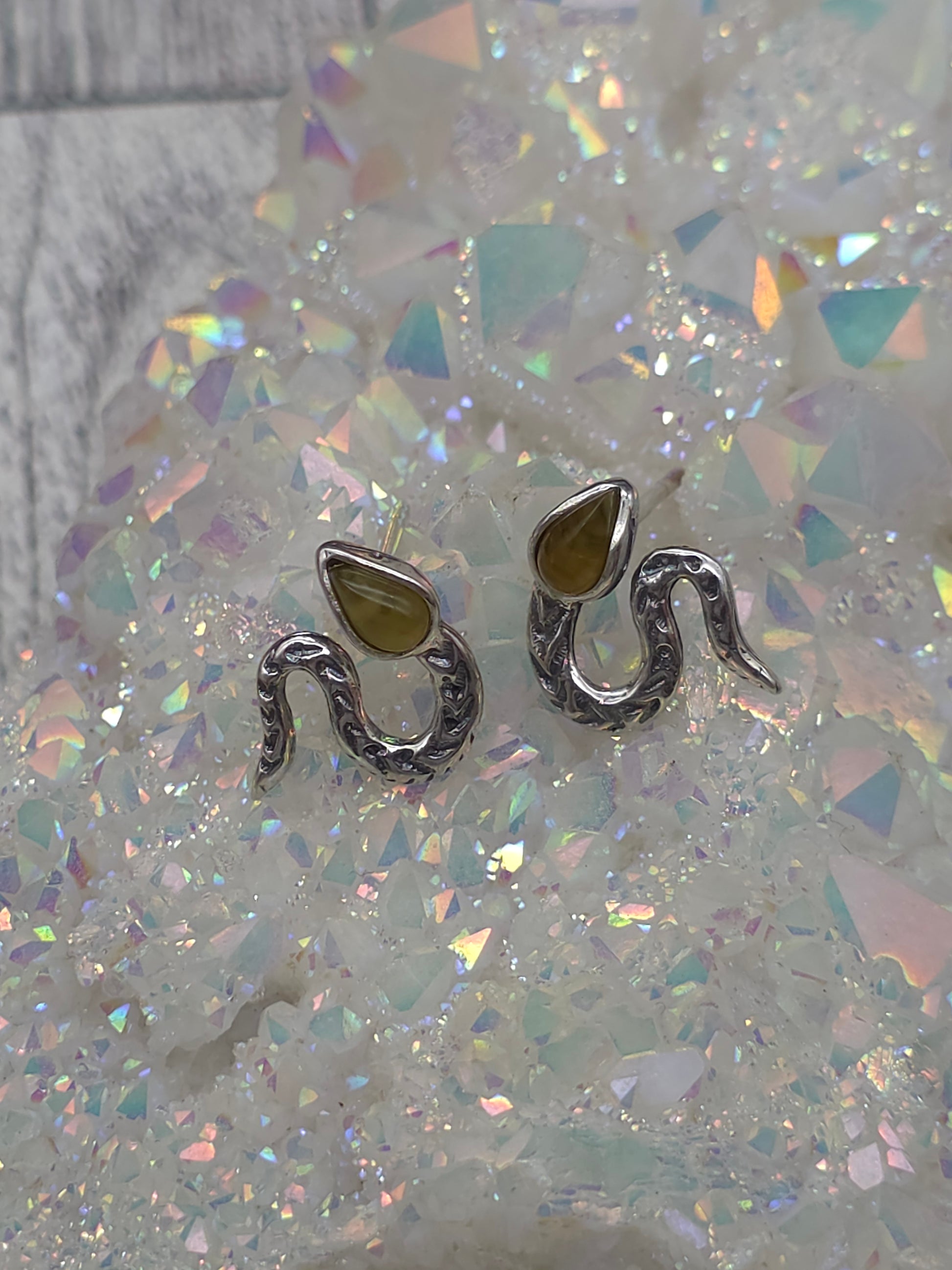 These dainty sterling silver snake post earrings are beautifully accented with tear drop amber heads, available in deep green or golden yellow. Snakes are powerful symbols of transformation and rebirth, making these earrings perfect for those embracing change or releasing what no longer serves them. Elegant and symbolic, they’re a subtle reminder of your own personal evolution.