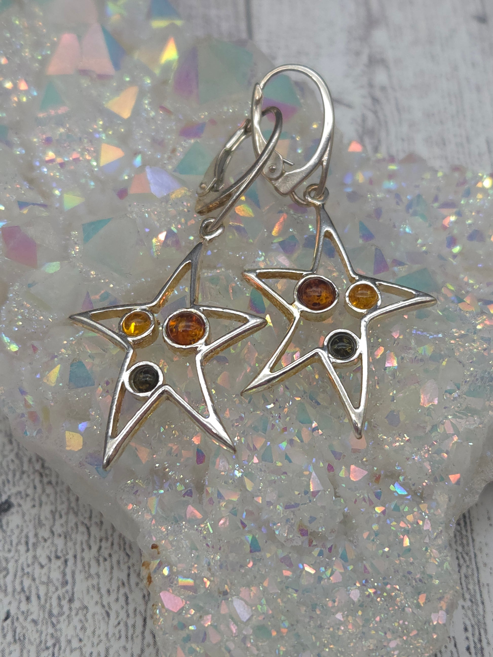 These elegant star‑shaped lever back earrings feature an open sterling silver design set with three luminous Baltic amber rounds in multi‑colored tones. The varied hues of amber glowing gold, deep brown, and rich green catch the light beautifully, creating a celestial sparkle that draws attention to the wearer. Lightweight and graceful, they combine a timeless shape with the warm, grounding energy of amber. These earrings make a meaningful gift or a radiant addition to any jewelry collection.