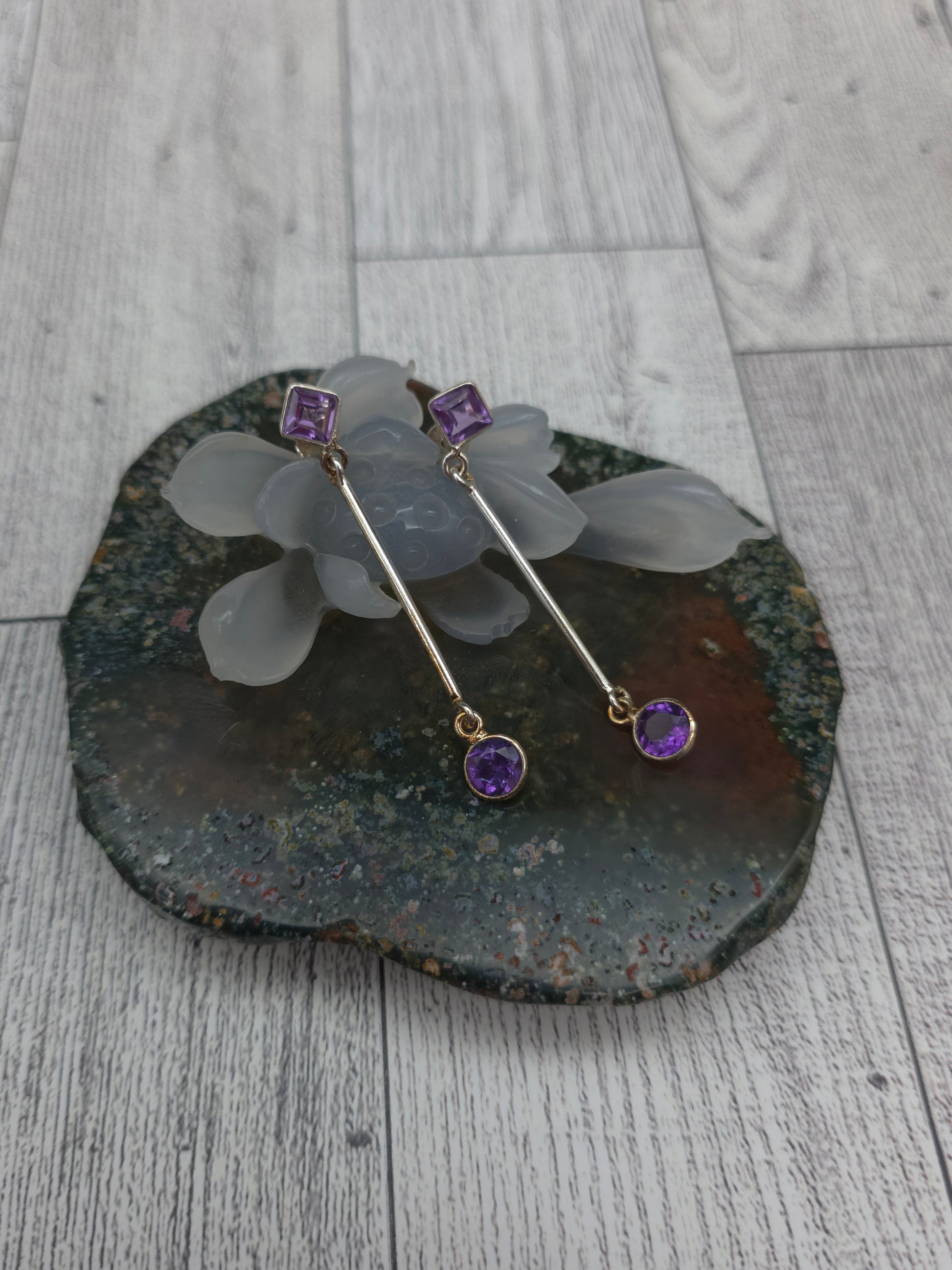These sterling silver post‑dangle earrings combine classic elegance with modern lines. Each earring features a square faceted amethyst at the top, connected by a sleek silver bar to a round faceted amethyst drop. The rich purple of the amethyst catches the light beautifully, offering a sophisticated shine and the calming, spiritually uplifting energy amethyst is known for. Lightweight and graceful, these earrings move gently with you and add a refined touch to any look everyday wear or special occasions alike.