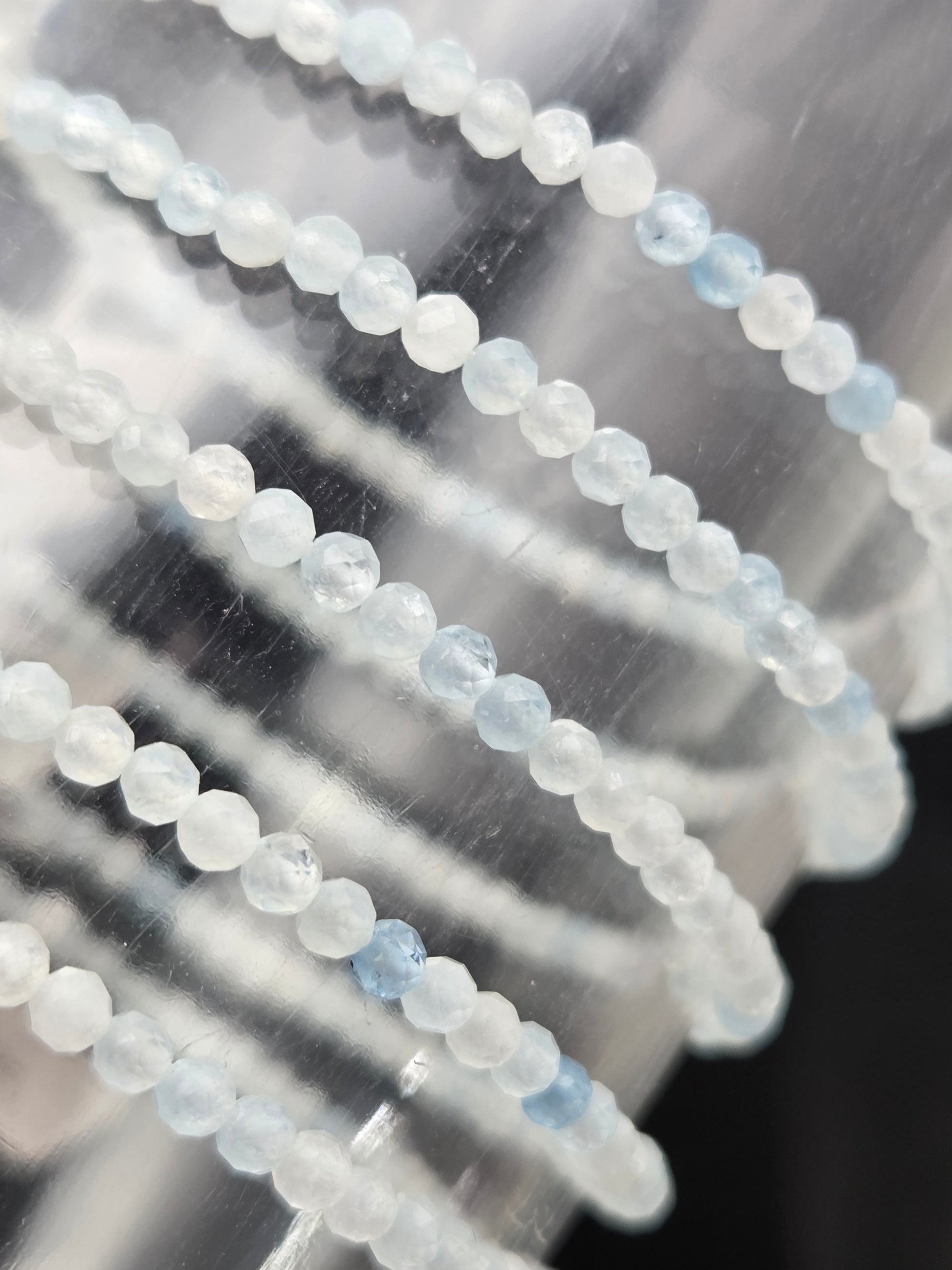 This delicate bracelet features 3mm faceted Aquamarine beads, shimmering with a soft, ocean-like calm. Aquamarine has long been cherished for its peaceful, cleansing energy. It is often called upon to ease stress, calm the nervous system, and support a sense of inner serenity.