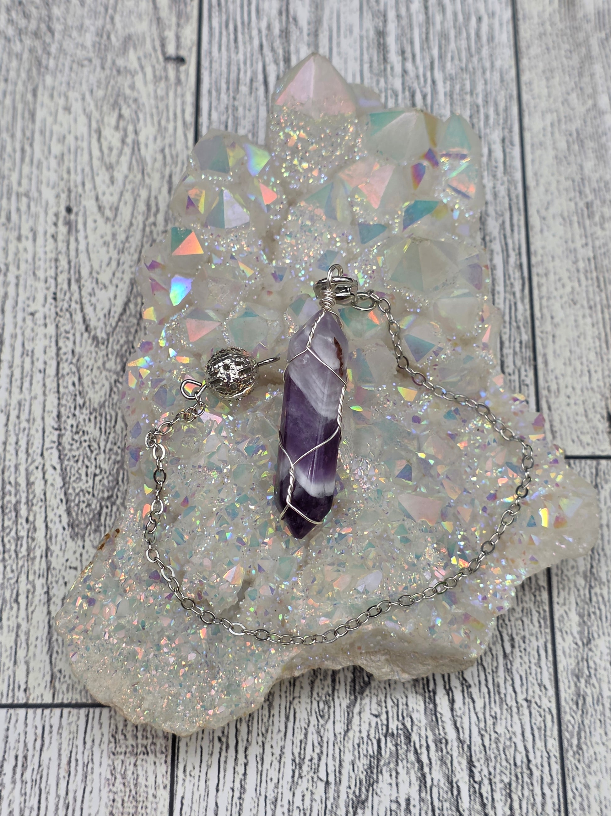 This elegant pendulum features a double‑terminated chevron amethyst point, wire‑wrapped in delicate stainless steel. Because it is double‑terminated, energy flows freely in both directions making it an exceptional tool for clear communication between your inner wisdom and external guidance. Chevron amethyst blends the clarity of quartz with the calming depth of amethyst. It supports the third‑eye and crown chakras by easing mental turbulence and opening you to new perspectives. Holding this pendulum invites a quiet shift a sense of trust in your subtle responses, a feeling of stillness in your center, and a gentle affirmation that you are supported. Each piece is handcrafted to reflect precision, beauty, and the high vibration this stone is known for.