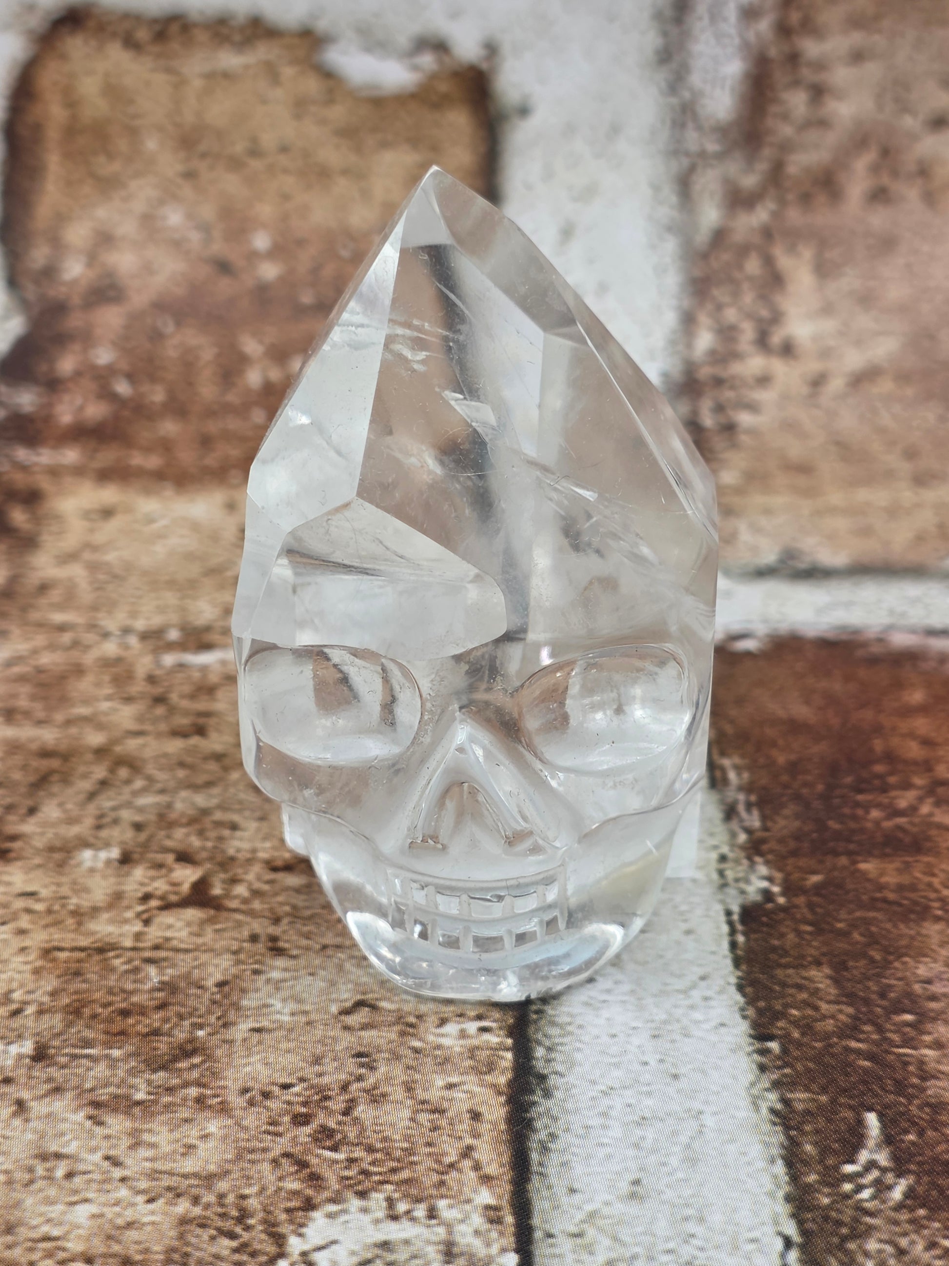 This striking Clear Quartz skull features a beautifully carved point rising from the top of the head, symbolizing heightened awareness and focused energy. Crystal skulls are powerful space holders that help create a safe container for deep healing, reflection, and transformation. Many people work with skulls when they are ready to look honestly at patterns, release what no longer serves them, and support healing within themselves and their ancestral lines.