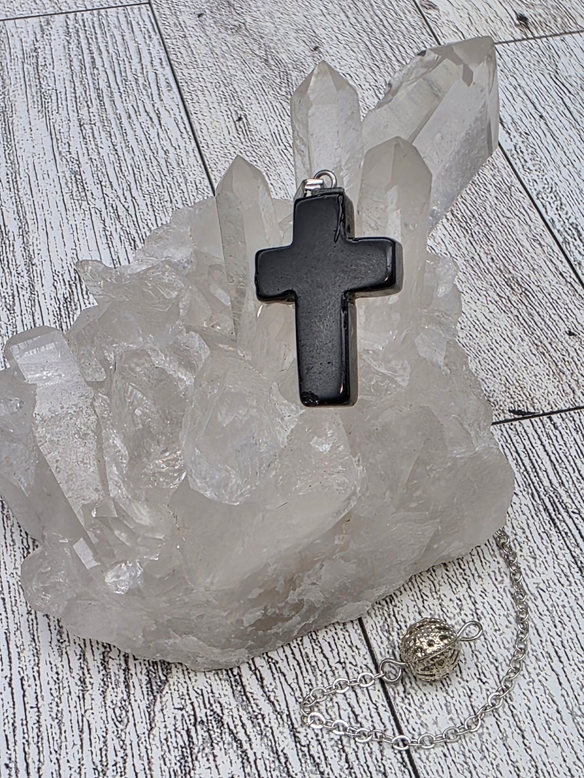 This piece is designed for those who wish to blend the symbols of faith with crystal vibration. The cross serves as a daily reminder of connection, while the pendulum allows you to engage with your intuitive guidance and the subtle energy of the moment. Whether you are seeking alignment, clarity, protection or spiritual insight, this tool can be, used in meditation, or held as you listen for messages and movement within.