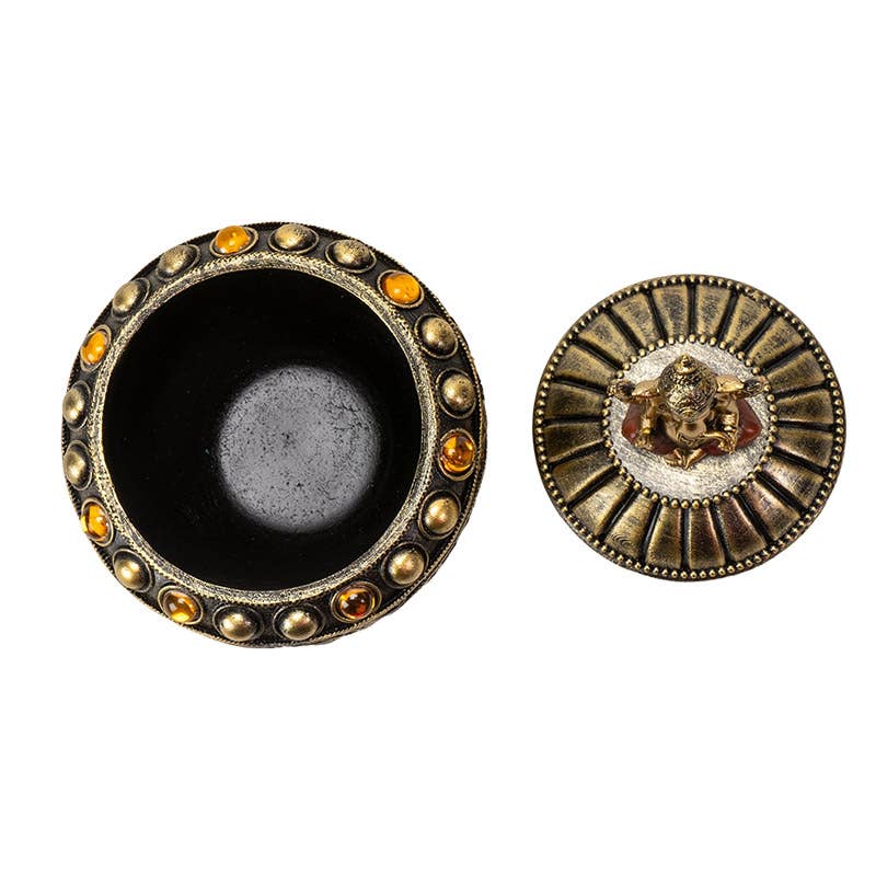 This beautifully detailed jar is dedicated to Ganesha, the revered Hindu deity known for removing obstacles and blessing new beginnings. Crafted from durable cold cast resin, it features a sculptural representation of Ganesha atop the lid, radiating presence, wisdom, and protection.