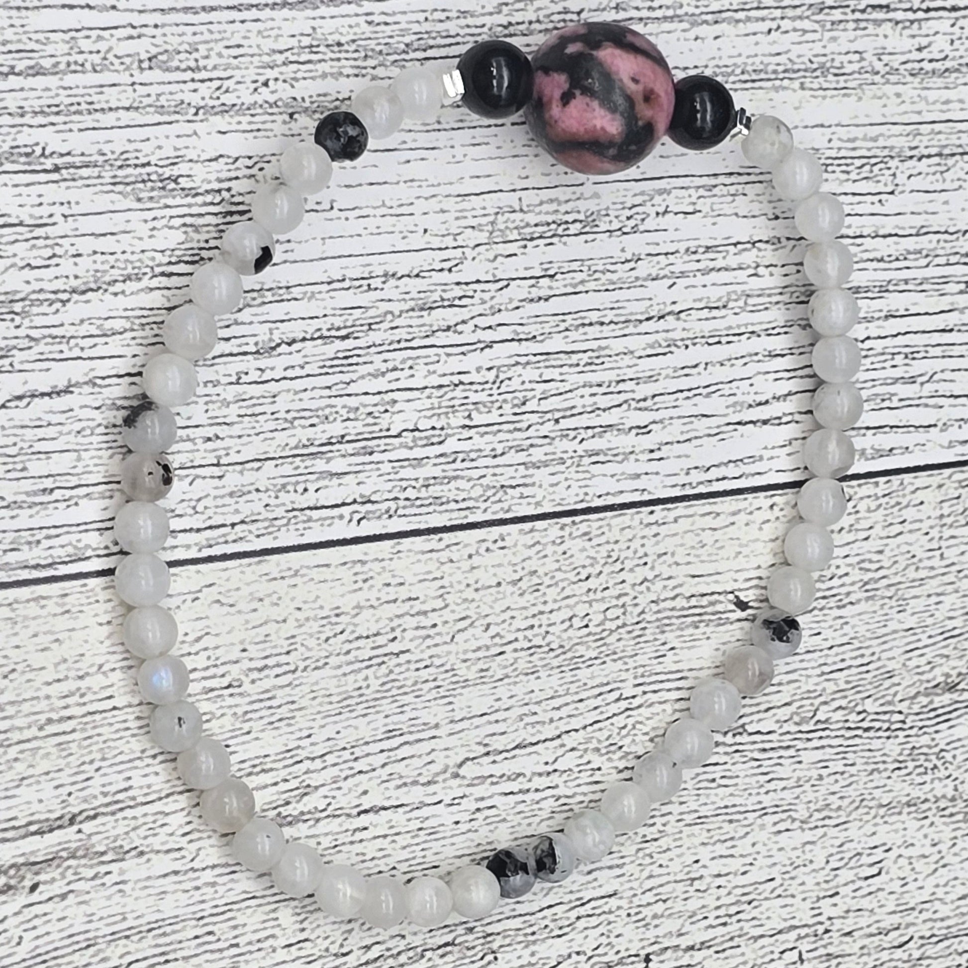 At its heart is Rhodonite, a stone of compassion, healing, and emotional harmony, paired with Black Tourmaline on either side to create a sense of safety and strength. Completed with Rainbow Moonstone, this bracelet brings in softness, intuition, and gentle empowerment.