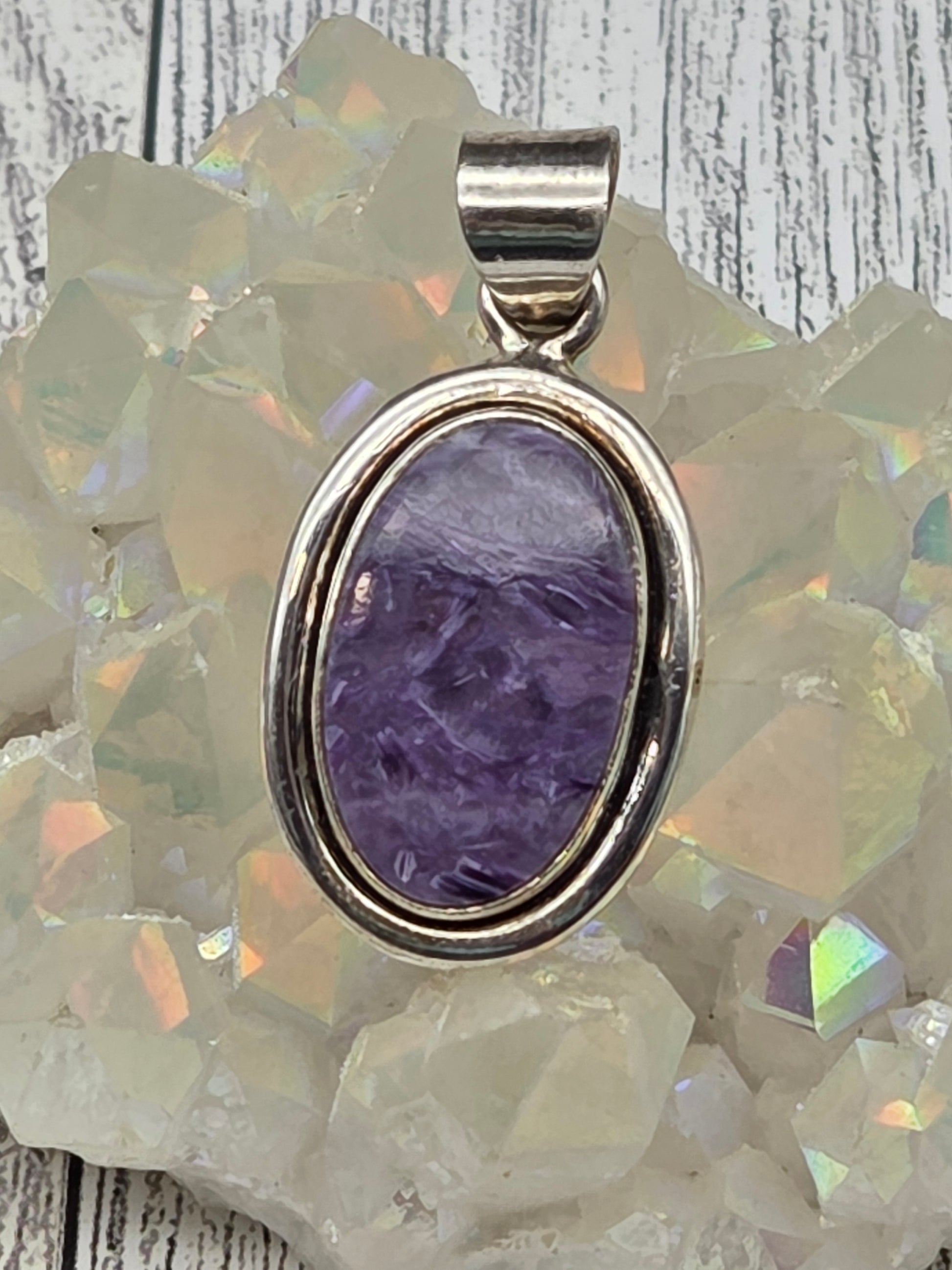 This oval charoite pendant features a beautifully polished stone set in a simple sterling silver bezel, allowing the natural beauty of this rare and striking mineral to take center stage. Swirls of deep purple, lavender, and soft violet tones create a mesmerizing landscape within the stone, each piece entirely one of a kind.