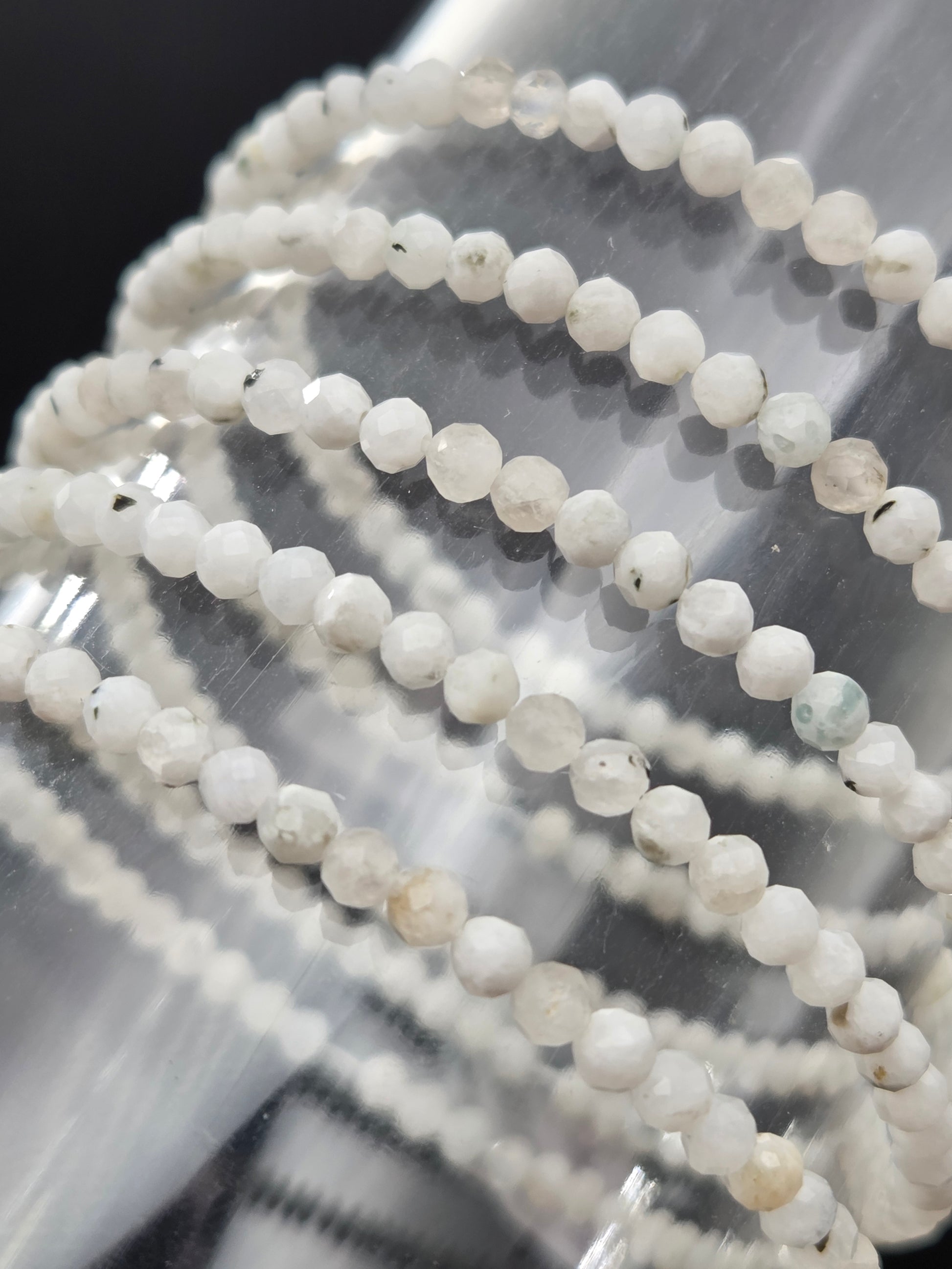 This bracelet is made with 3mm faceted Rainbow Moonstone beads, each one carrying a quiet shimmer that reflects light and intuition in equal measure. Rainbow Moonstone is cherished for its calming and harmonizing energy, often chosen as a gentle support for emotional balance, clarity, and spiritual connection.