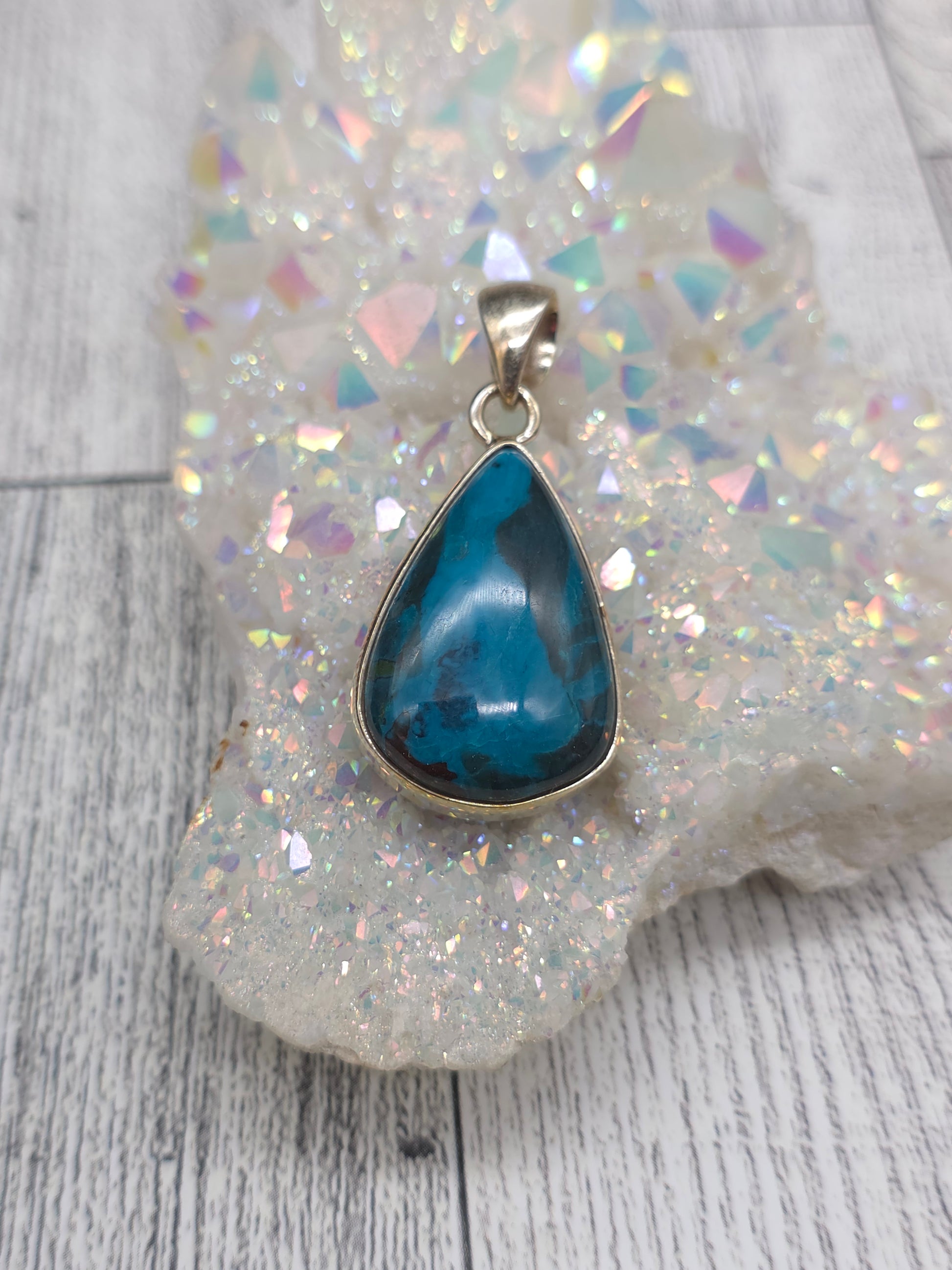 This stunning teardrop-shaped Shattuckite pendant is set in sterling silver, showcasing the stone’s vivid blues and natural patterns. Shattuckite is a powerful stone of truth, intuition, and communication. It is especially helpful for those seeking to deepen their spiritual insight or enhance their ability to speak clearly and authentically. Often associated with the Throat and Third Eye Chakras, Shattuckite promotes clarity of thought, inner wisdom, and alignment with your highest self. This pendant is perfect for daily wear or as a meaningful gift for anyone navigating personal growth, spiritual connection, or a journey toward self-expression.