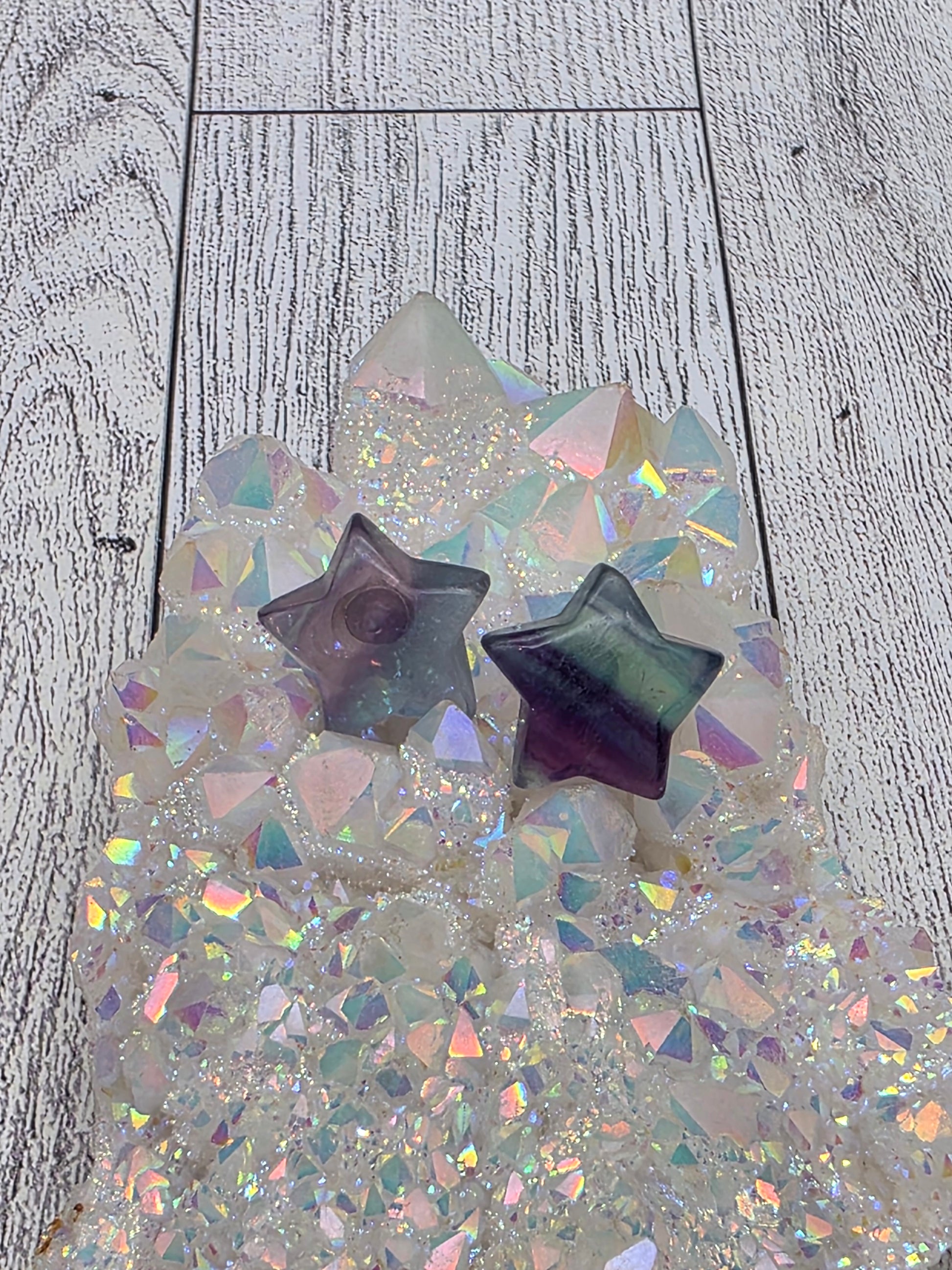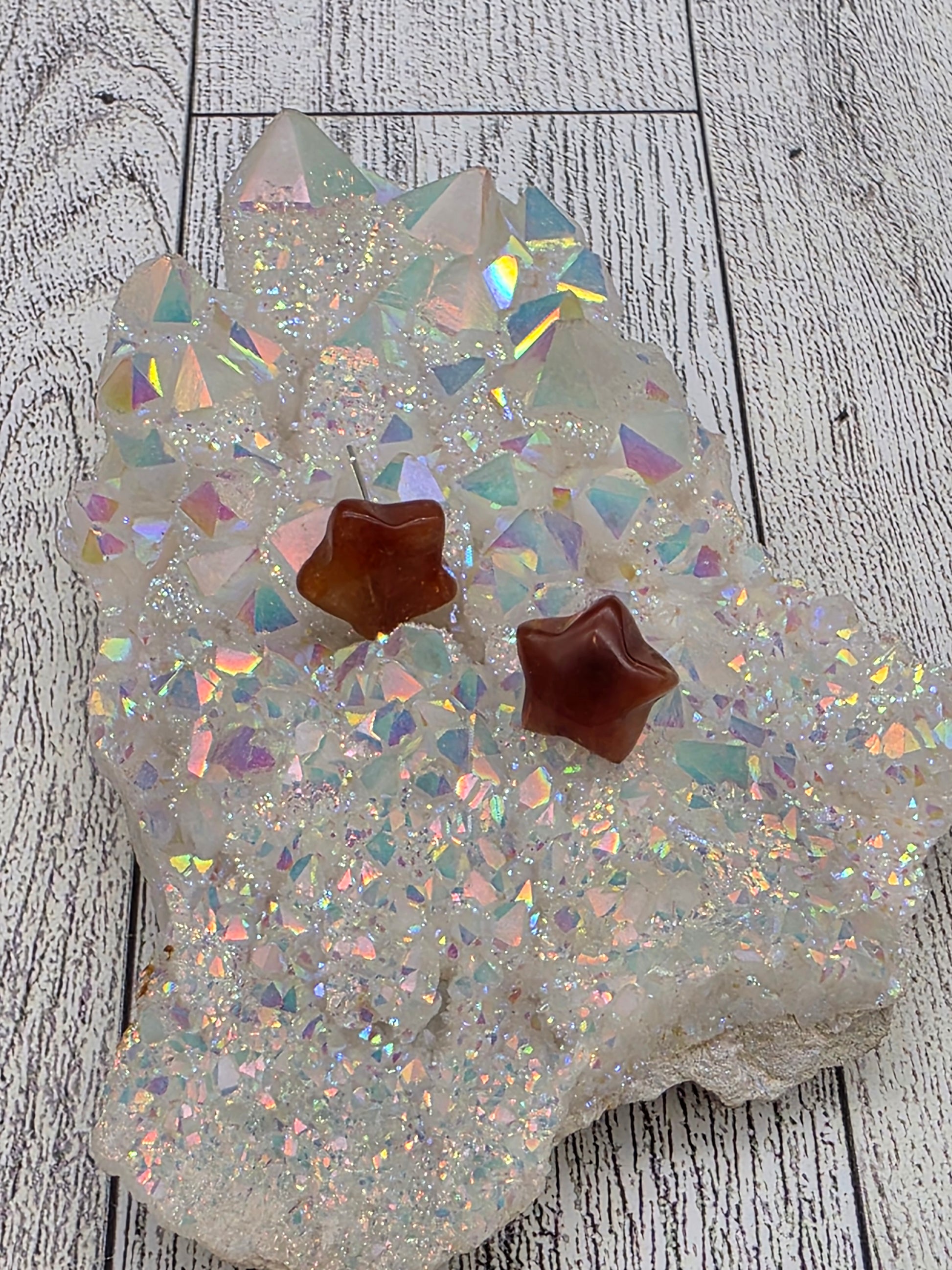 Celebrate your unique light with these elegant star‑shaped crystal post earrings. Available in Fluorite, Fire Quartz, Blue Apatite and Tiger Eye, each pair blends refined design with meaningful crystal energy.